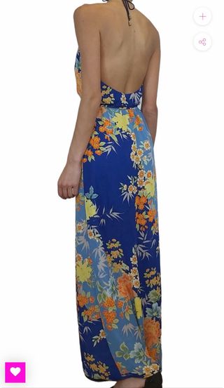 Vestido largo de Guess con estampado floral, nuevo sin estrenar, con etiqueta. - Diseño halter. - Cintura marcada con cinturón. - Abertura lateral en la falda. - Estampado Sakura con flores amarillas y naranjas sobre fondo azul.