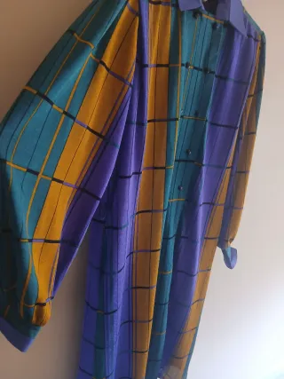 Vestido con un diseño geométrico llamativo y moderno. - Estampado abstracto con formas geométricas. - Combinación de colores vibrantes y oscuros. - Diseño de patchwork con diferentes patrones.