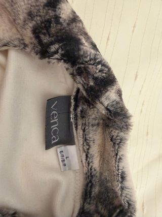 Vestido de invierno con un diseño elegante y cálido. - Cuello con detalle de pelo. - Color blanco con estampado jaspeado en el cuello.