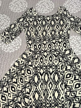 Vestido de invierno blanco y negro de mujer de la marca Anany, talla 46. Tiene los botones dorados en cuello y mangas tal y como se aprecia en las fotos, de hombros hasta final de falda mide de largo 98cm y tiene una pequeña marca en uno de los dibujos blancos (también en foto) que sólo se aprecia de cerca si se localiza, porque es muy leve. Es muy favorecedor, tiene un corte bonito.