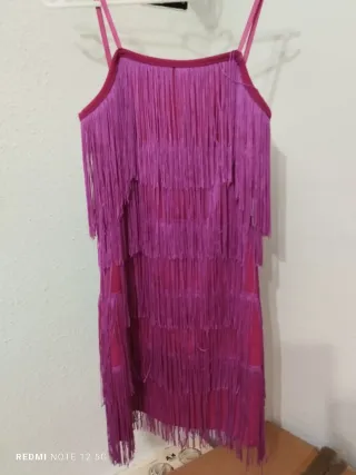Vestido de fiesta corto con flecos en color fucsia. Ideal para eventos especiales.puesto una sola vez - Diseño con tirantes finos. - Múltiples capas de flecos. - Largo hasta la rodilla.