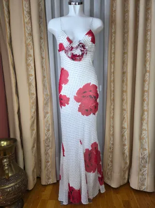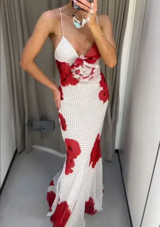 Vestido largo con estampado de flores rojas y lunares blancos. Nuevo sin estrenar con etiquetas Varias tallas disponibles, no dudes en escribirme - Diseño con tirantes finos. - Escote pronunciado con detalle de volantes. - Corte ceñido que se ensancha en la parte inferior.
