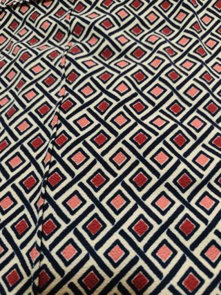 Vestido de manga larga con un estampado geométrico en tonos beige, rojo y negro. - Diseño de rombos. - Cuello redondo.