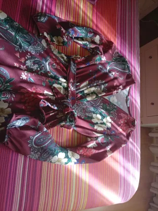 Elegante vestido largo con un estampado floral vibrante y detalles de paisley. Su diseño cruzado con cinturón ajustable realza la figura. - Manga larga abullonada. - Escote en V. - Largo hasta los tobillos. - Tejido ligero y fluido. - Es talla única, pero yo tengo una 44 y me valía -En perfectas condiciones. -Hago envío El precio no es negociable, está nuevo.