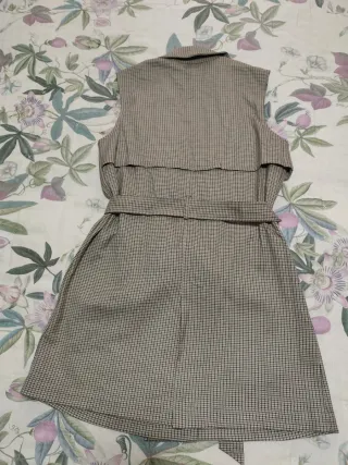 Vestido con estampado de pata de gallo, ideal para añadir un toque elegante a tu atuendo. - Diseño sin mangas. - Doble botonadura. - Cinturón para ajustar. - Cuello solapa.