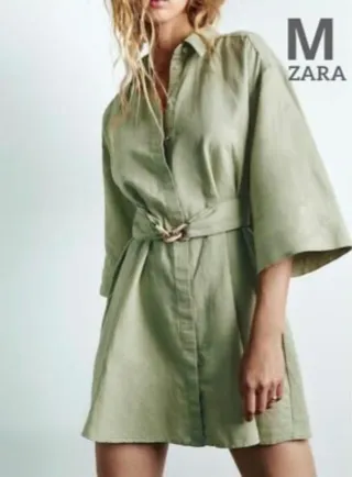 Vestido camisero de lino corto. - Color verde oliva. - Talla S - Diseño con cinturón.