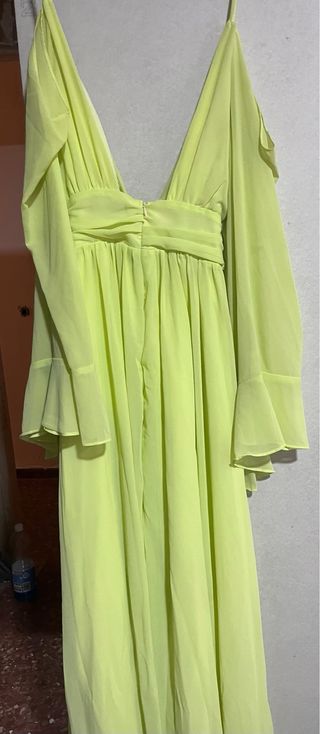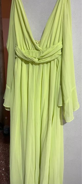 Vestido largo de tela vaporosa con escote pronunciado y mangas acampanadas. - Diseño drapeado en la cintura. - Corte fluido. Color lima Vestido ceremonia