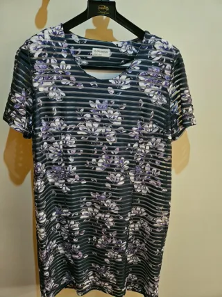 Vestido de tela suave y diseño moderno. - Color: azul con flores moradas - Talla: 52