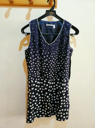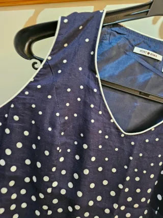 Vestido de verano con un diseño de lunares. - Diseño sin mangas. - Cuello en V. - Ribete blanco.