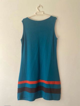 Vestido de estilo pop con un vibrante color azul y detalles florales. Tejido elástico, sin mangas, largo por la rodilla, con adornos de flores en la parte delantera y banda horizontal naranja y negra. Talla XL aunque es una L/42.
