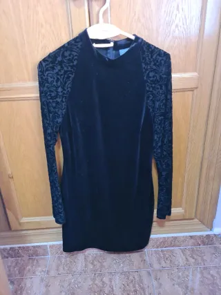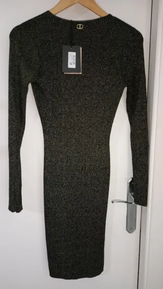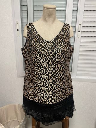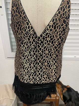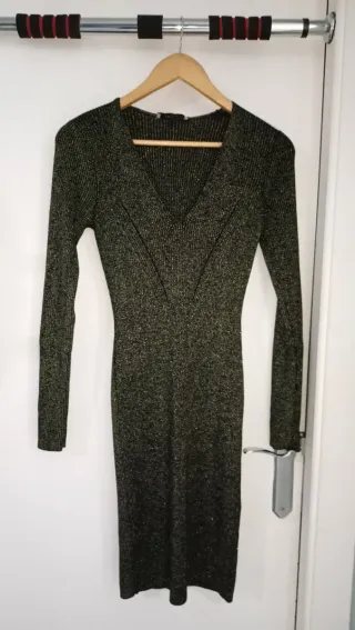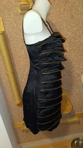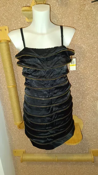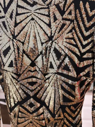 Vestido lentejuelas dorado y negro. Tiene protectores en la parte del pecho. Vale para XS y S.