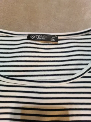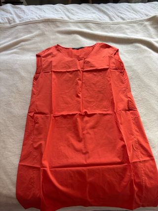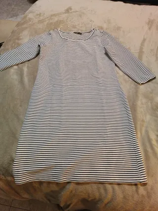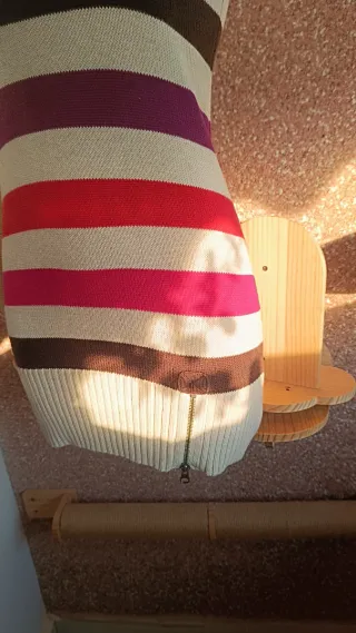Vestido de punto con un diseño de rayas multicolor. Es una prenda cómoda y versátil, sin mangas - Diseño de rayas horizontales. - Escote en pico. - Tejido de punto. En la talla pone L pero da menos talla