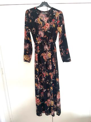 Elegante vestido largo con un estampado floral vibrante. Perfecto para cualquier ocasión. - Diseño de manga larga. - Cintura elástica para un ajuste cómodo. - Largo hasta los tobillos.
