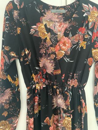 Elegante vestido negro de tela de terciopelo. - Mangas largas con estampado floral. - Cuello alto. - Corte recto.