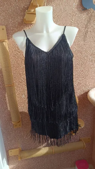 Vestido corto con un diseño llamativo de flecos brillantes. - Diseño de tirantes finos. - Flecos en cascada que añaden movimiento. - Acabado brillante. Es mucho más bonito que en las fotos Usado para una cena