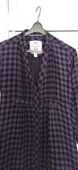 Vestido camisero con un estampado de cuadros clásico en tonos morado y negro. Presenta un diseño con cuello mao y botones frontales. - Detalle de pliegues en la parte delantera.