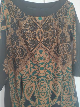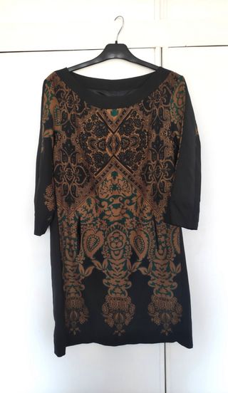 Vestido con un llamativo estampado. - Diseño con mangas largas. - Cuello redondo. - Estampado paisley en tonos marrones y verdes sobre fondo negro.