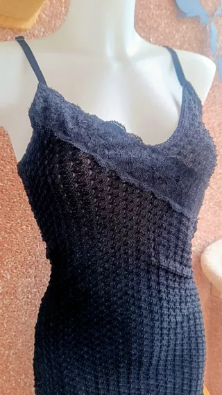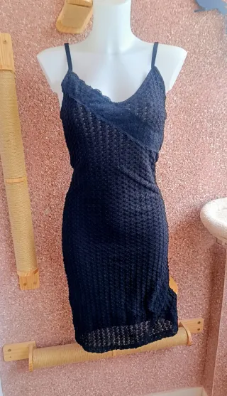 Vestido negro de encaje con forro debajo - Diseño con tirantes finos. - Escote en V con borde de encaje. - Tejido texturizado. Sienta genial, para ocasiones especiales