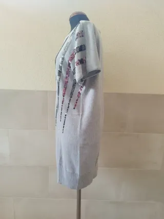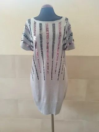 Precioso vestido gris con lentejuelas. Cuello redondo. No falta ninguna lentejuela. Elegante con punto brillante. Marca :George Talla :12(corresponde a una L) Medidas : Largo 88 cm De axila a axila 48 cm 100% algodón. Está en muy buen estado.