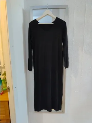 Vestido de manga larga, ideal para el invierno. - Diseño de cuello en V. - Corte recto y largo hasta la rodilla.