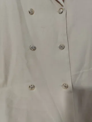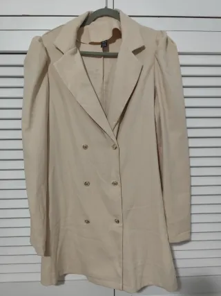 Elegante vestido estilo blazer en color beige. Una prenda versátil que combina estilo y comodidad. - Diseño de doble botonadura. - Mangas abullonadas. - Cuello solapa clásico. Nuevo sin etiqueta, nunca ha sido estrenado