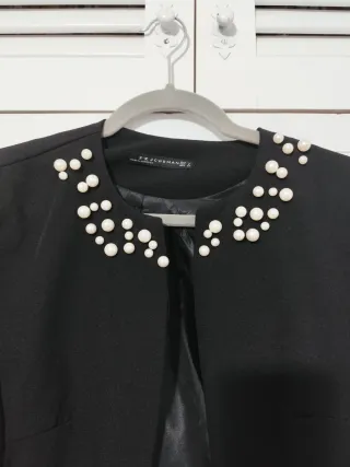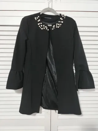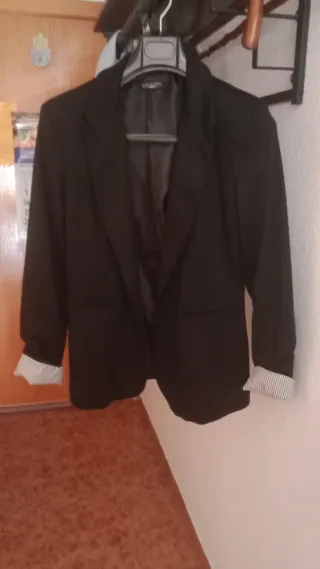Elegante chaqueta de vestir negra, usada una sola vez. - Diseño moderno y sofisticado. - Ideal para ocasiones formales o de oficina. - Acabado de calidad.