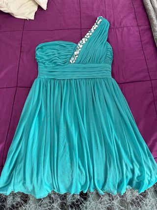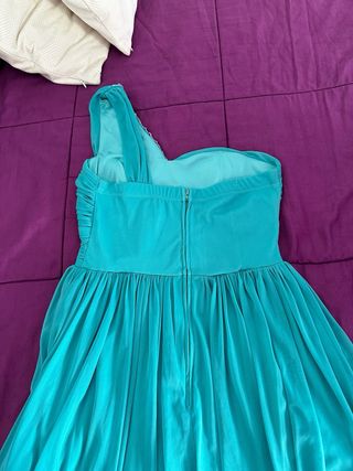 Elegante vestido de fiesta con un diseño de un solo hombro. - Escote drapeado. - Adorno de pedrería en el escote. - Cintura marcada con pliegues. - Falda vaporosa y fluida. (Tiene una carrera por detrás “adjunto foto” pero puesto apenas se aprecia)