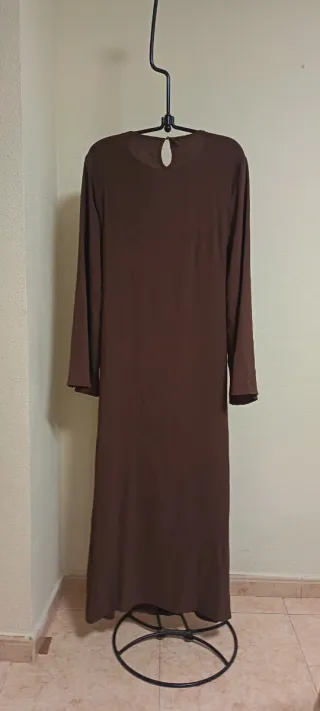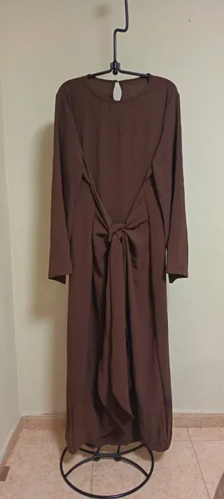 Vestido largo de color marrón, muy cómodo y estiliza la figura. Presenta un diseño con lazada en la cintura. - Manga larga. - Cuello redondo con abertura. - Lazada frontal.