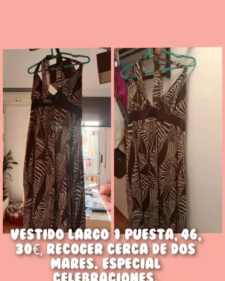 Vestido largo con estampado llamativo, ideal para celebraciones. - Talla 46. - Largo. - Estampado. - Ideal para eventos especiales.