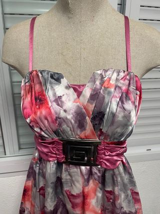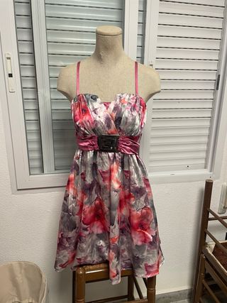 Vestido de fiesta con estampado floral y torera a juego. - Diseño con tirantes finos. - Cinturón con detalle metálico. - Tejido satinado.