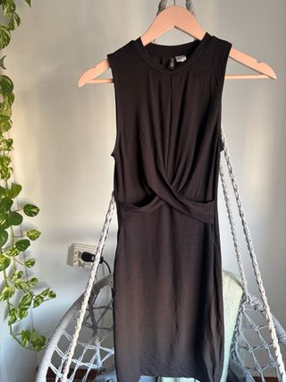 Vestido negro de H&M con un diseño cruzado en la cintura. - Diseño sin mangas. - Cuello redondo. - Tejido elástico.