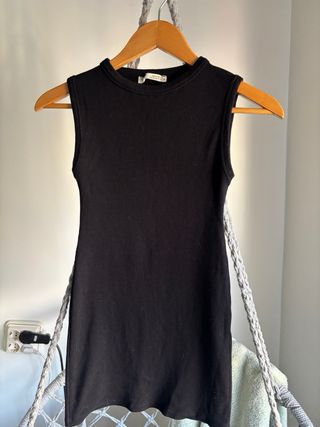 Vestido negro de canalé de Pull and Bear. Es un vestido ajustado y sin mangas, con cuello redondo. - Tejido elástico y acanalado. - Diseño minimalista y versátil. - Muy cortito