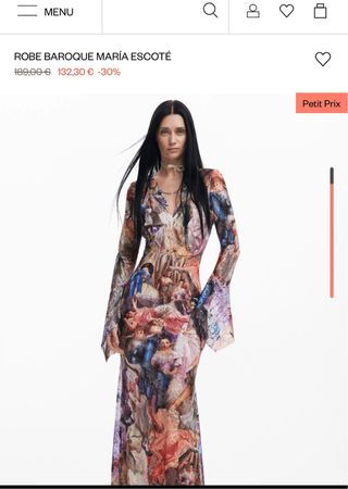 Vestido largo con detalles de encaje y estampado de inspiración barroca diseñado por María Escoté. Corte: Delgado Cuello en V Manga: larga Cierre: Cremallera lateral Aplicaciones de encaje poliéster reciclado - Diseño de manga larga acampanada. - Escote en V. - Estampado detallado de figuras. - Largo hasta el suelo.