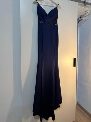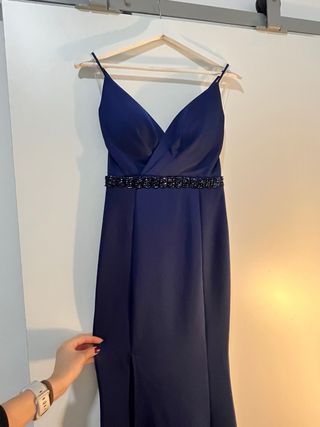 Elegante vestido largo de corte sirena en color azul marino. Presenta un detalle de pedrería en la cintura. - Tirantes finos. - Escote en V. - Abertura lateral en la falda. - Adorno de pedrería en la cintura. - Talla S - Elegante y estiliza la figura muchísimo