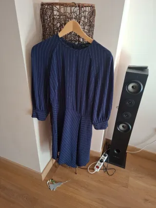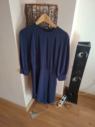 Vestido de manga larga con un diseño de rayas verticales blancas sobre fondo azul marino. - Cuello redondo. - Mangas abullonadas con puño. - Corte entallado en la cintura. - Largo hasta la rodilla.
