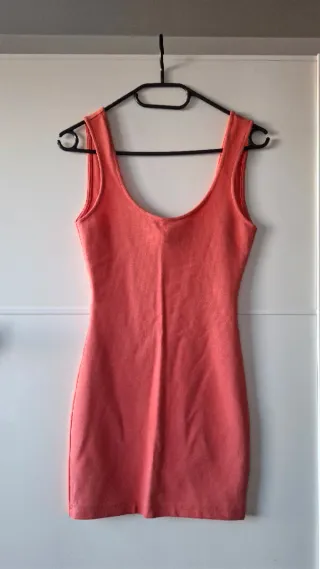 Vestido corto y ajustado de color naranja con detalle de lazo en la espalda. - Diseño sin mangas. - Escote redondo. - Tejido elástico.