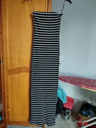 Nuevo usado en dos ocasiones. Vestido largo con un diseño de rayas horizontales en blanco y negro. Es un modelo sin tirantes, estilo palabra de honor.Con abertura parte de atrás - Diseño ceñido al cuerpo. - Tejido elástico.
