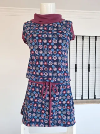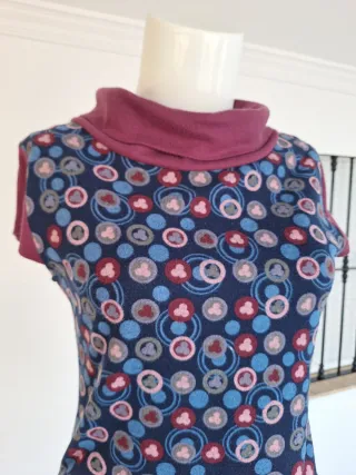 Vestido con cuello alto y estampado de en tonos azules, rosas y gris. 95% poliéster - 5% elastano Medidas: - Largo: 94 cm - Ancho: 48 cm - Hombro: 44 cm