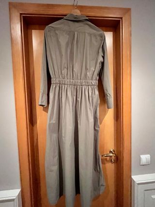 Vestido largo de Zara en color verde oliva. Con un diseño de cuello camisero con botones en la parte delantera y cintura elástica. Efecto paperbag que lo hace muy ligero. - Manga larga. - Cuello camisero. - Cintura fruncida. - Bolsillos