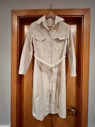 Vestido largo de Zara en color beige, con cinturón a juego. - Diseño camisero. - Dos bolsillos en el pecho. - Manga larga. Nuevo sin etiqueta.