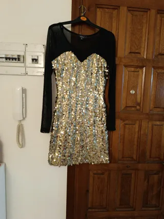 Vestido corto con lentejuelas brillantes. - Diseño con manga larga. - Escote redondo. - Acabado con lentejuelas.