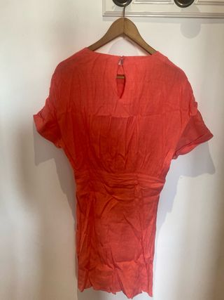 Vestido de fiesta corto con un diseño elegante. - Escote en V con detalle de lazo. - Cinturón plateado brillante. - Falda abullonada. - Tejido texturizado. Vestido corto para boda. Color rosa claro asalmonado. Diseñadora Miriam Ocariz. Talla 34/xs. En muy buen estado.
