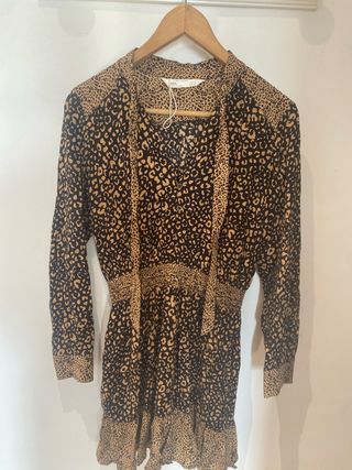 Vestido de Zara con un llamativo estampado de leopardo. - Diseño con cuello - Cintura elástica - Mangas largas - Bajo con volantes -Elástico en la parte de la cintura
