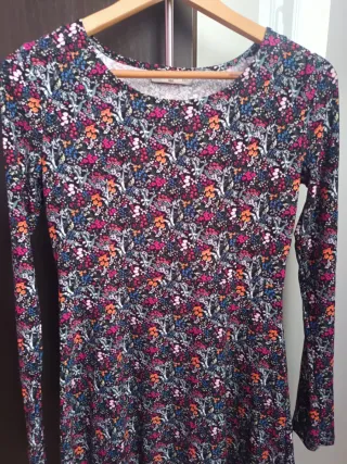 Vestido de manga larga con un estampado floral vibrante y detallado. - Diseño de cuello redondo. - Corte que favorece la figura. - Tejido suave y cómodo.