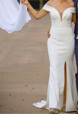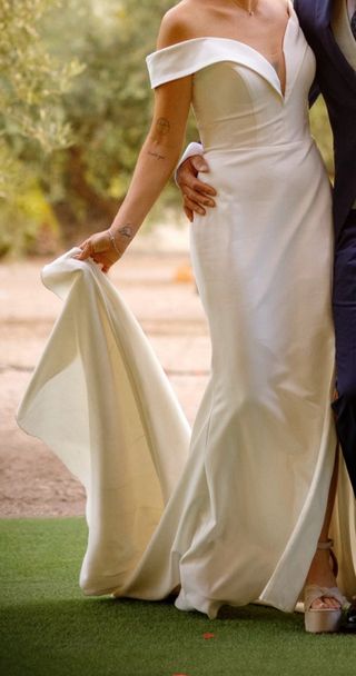 Vestido de novia liso y elegante, con un diseño precioso. - Escote Bardot. - Corte sirena. - Abertura lateral en la falda.