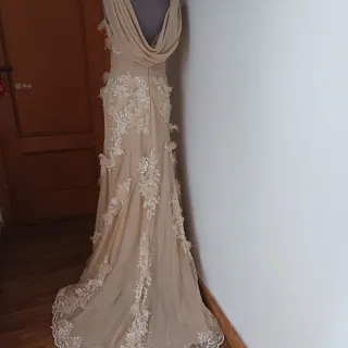Elegante vestido de novia en tono beige, con detalles de encaje y aplicaciones. Esta lavado - Diseño con escote drapeado. - Falda larga con cola. - Adornos florales y plumas.