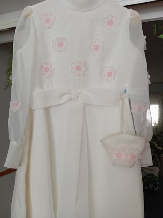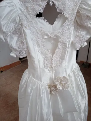 Vestido de comunión de encaje con detalles. - Diseño de manga corta. - Falda con vuelo. - Incluye cinta decorativa. - Talla niña 12 años. - Marca italiana.