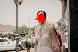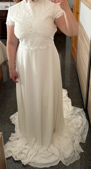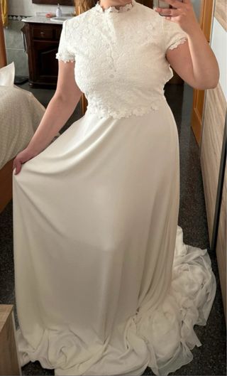 Elegante vestido de novia con detalles de encaje. - Cuerpo de encaje con cuello alto. - Mangas cortas de encaje. - Falda larga y fluida. Vestido Victoria Coleccion a estrenar 🥰👰😍 Es un vestido ideal y súper cómodo de la gran diseñadora Vicky Martin Berrocal. Se vende con su guardapolvo y funda. Tiene una tela genial y de muy buena calidad realizado completamente en España. Se podría usar también como segundo vestido para la fiesta porque es súper cómodo y no aprieta nada. Vestido con cuerpo de guipur y falda de gasa. Cuello a la caja. Espalda abierta con una gran lagrima central. Precio original 1790€ REBAJADISIMO!!!