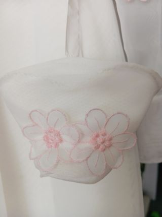 Vestido de comunión talla 110. Se le podría sacar unos 2 cm más. - Diseño con fajín y flor. - Mangas cortas con detalles. - Falda larga y vaporosa. Incluye can-can