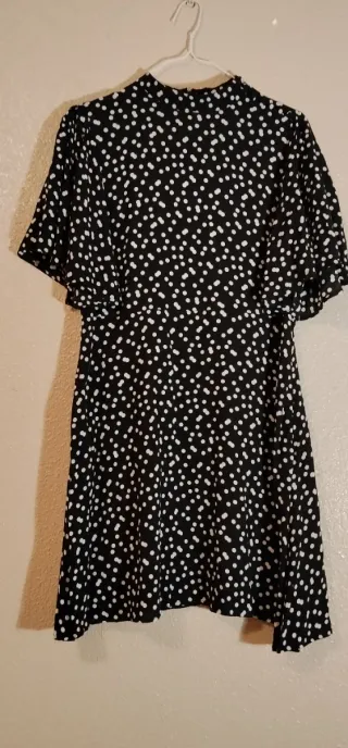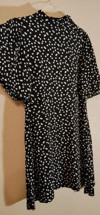 Vestido con un estampado clásico de lunares. - Diseño de lunares blancos sobre fondo negro. - Falda asimétrica. - Cuello alto con botones. - Mangas cortas abullonadas. - Cierre con cremallera..